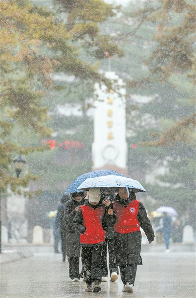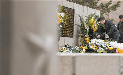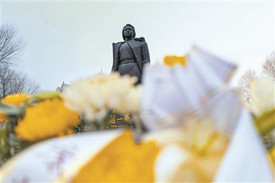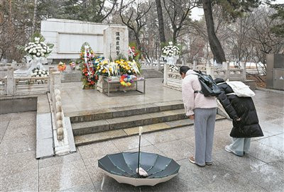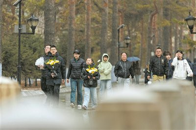 清朗节春雪纷飞,义士陵寝的甬谈上,前来献花祭扫的市民滚滚不竭。