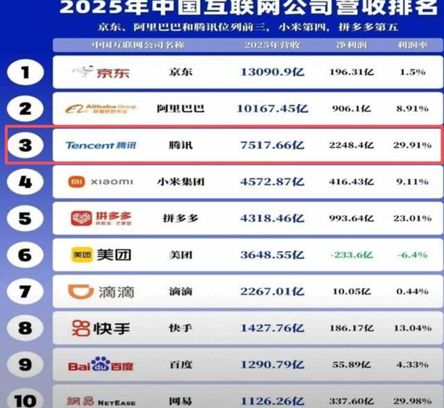 2025年,中国总共的互联网企业中,腾讯是利润最高的,收入7517.66亿元,利润2248.4亿元,利润率29.91%,在互联网企业中,发扬非常可以。